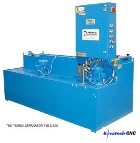 The T10-3-315 is a complete centrifuge system that removes solids and tramp oil from coolants. It discharges cleaned coolant into the clean tank, removes tramp oil to an oil tank ,and solids are removed via a large easy-to clean liner. Components include a 3 phase centrifuge, dirty and clean holding tanks, transfer and feed pumps, a coolant make-up system and automatic valves and controls.